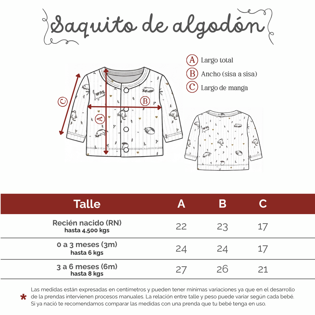 Nuestro saquito es el aliado perfecto para el día a día, diseñado para adaptarse a los cambios de clima durante todo el año. Su suavidad y practicidad lo convierten en una pieza esencial que aporta confort sin importar la temperatura exterior. Está confeccionado en 100% algodón de primera calidad, una fibra natural que permite que su piel respire, evitando irritaciones y manteniéndolo cómodo durante todo el día.